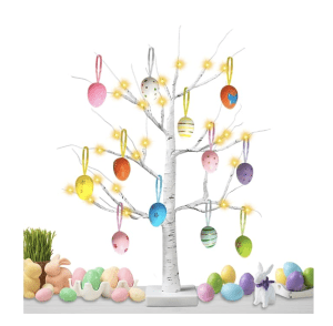 A charming lighted Easter egg tree that instantly brings a bit of spring cheer to your home. The tabletop birch-style tree features 24 warm white LED lights and 12 hanging egg ornaments, creating a soft glow that works beautifully as a centerpiece or seasonal décor for a shelf or entry table.