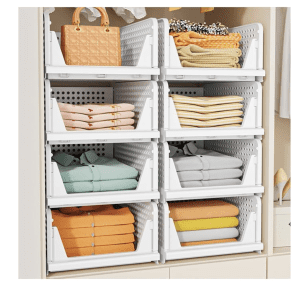 These stackable closet storage baskets make it easy to bring order to cluttered shelves and wardrobes. The foldable bins stack vertically to maximize space and are made from durable, waterproof plastic, making them a simple solution for organizing clothes, accessories, or household items throughout your home.