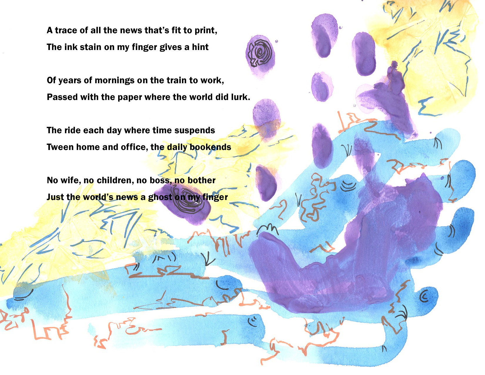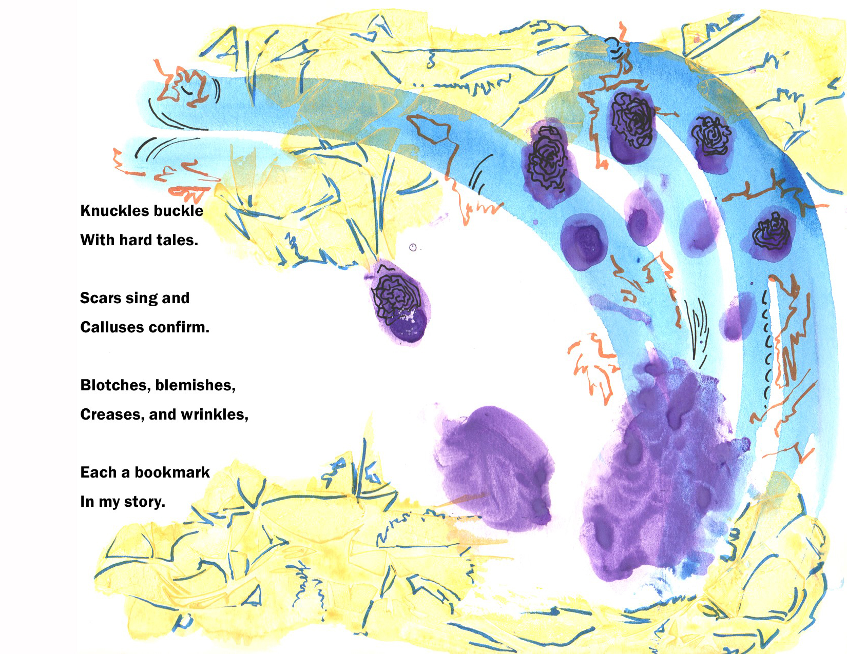 Today’s poem, “My Hands Hold History” is part of a new direction for Dave. As he himself describes it, “I’ve always been intrigued by the idea of combining words and images, so this project represents a sort of visual poetry. The theme of the work comes first, then the poetry and artwork are created pretty much simultaneously until the piece is finished. I envision the final product being a book with some 20 to 30 multiple-page pieces in different visual and textual styles, all on the subject of growing older as I experience it. The book will be a visual poetry collection titled “Visions of a Certain Age.” In support of this project, Dave has received a grant from ArtsWestchester with funding from the NYS Council on the Arts. This past July, agebuzz was fortunate to publish “Socks” from this upcoming collection, and in October we were pleased to publish “Without Them.” Dave welcomes your comments and feedback on this poem or any of his previous pieces on agebuzz. Please feel free to reach out to him at [email protected]
