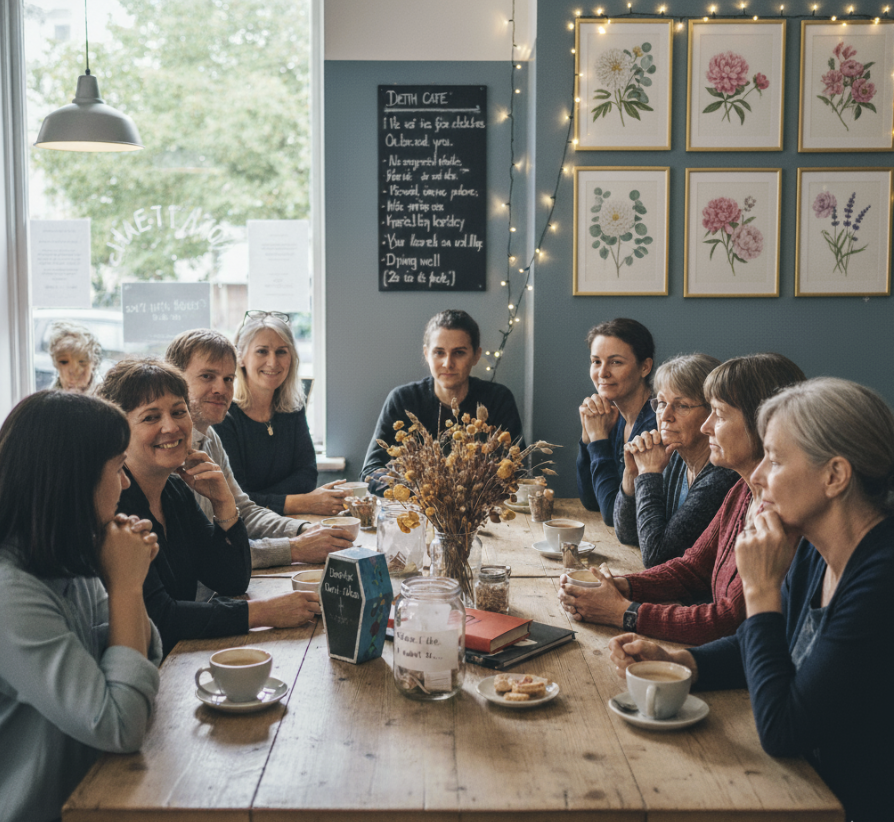 A Death Café is a group-led, open discussion about death, held in a respectful setting—preferably with tea and cake. The aim isn’t to grieve or make decisions; it’s to openly talk about mortality topics, helping people live more fully.