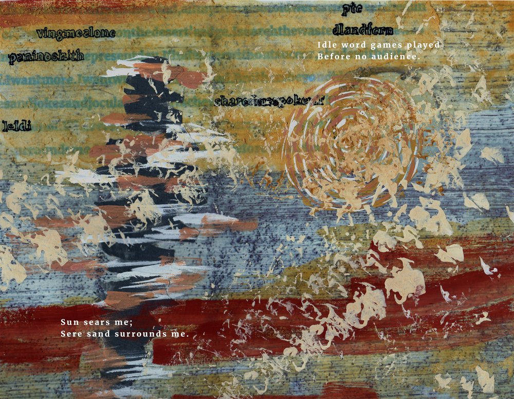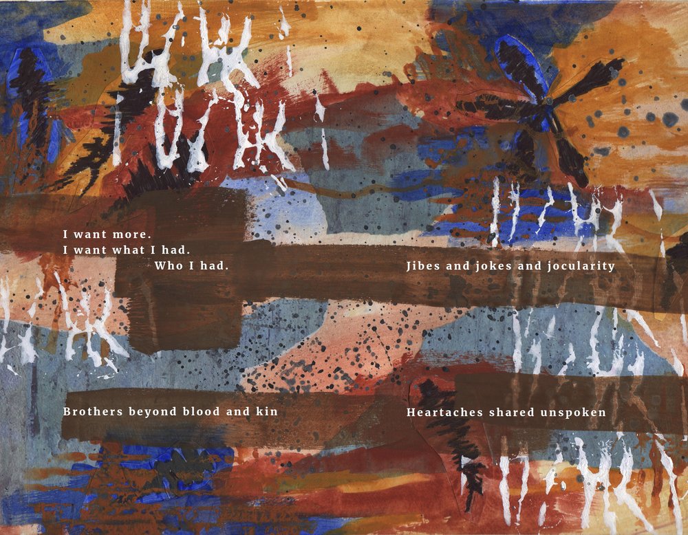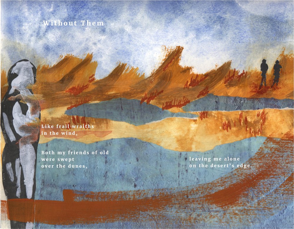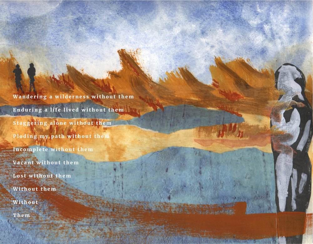 Today’s poem, “Without Them” is part of a new direction for Dave. As he himself describes it, “I’ve always been intrigued by the idea of combining words and images, so this project represents a sort of visual poetry. The theme of the work comes first, then the poetry and artwork are created pretty much simultaneously until the piece is finished. I envision the final product being a book with some 20 to 30 multiple-page pieces in different visual and textual styles, all on the subject of growing older as I experience it. The book will be a visual poetry collection titled “Visions of a Certain Age.” In support of this project, Dave has received a grant from ArtsWestchester with funding from the NYS Council on the Arts. This past July, agebuzz was fortunate to publish another piece from this upcoming collection entitled “Socks.” This new work, “Without Them,” was originally published in the Stoneboat Literary Journal.